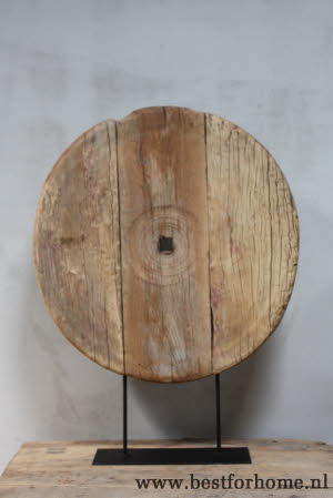Landelijk Uniek Oud Houten Wiel op Standaard China Robuust Object NO.510 VERKOCHT!
