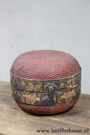 Authentieke Ronde Chinese Rieten Box Landelijke Oude Mand NO.363 VERKOCHT!