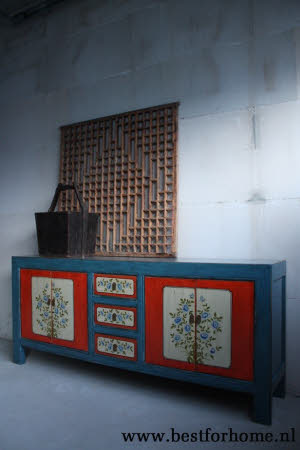 Oosters Houten Kastje Uniek Chinees Blauw Gekleurd Dressoir NO.506