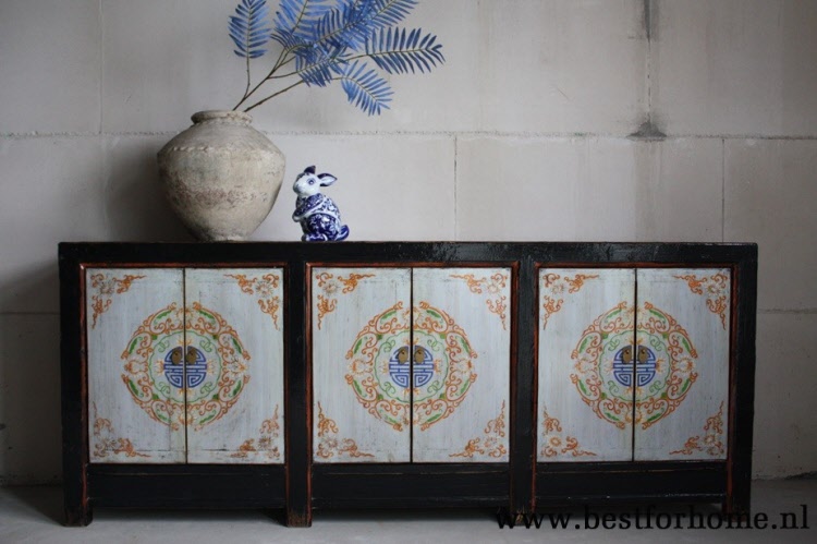 • Oosters groot origineel beschilderd oud houten 6-deurs dressoir / kast NO.876...