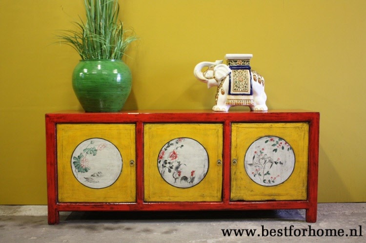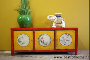 • Uniek kleurrijk origineel beschilderd 3-deurs dressoir uit China NO.414...