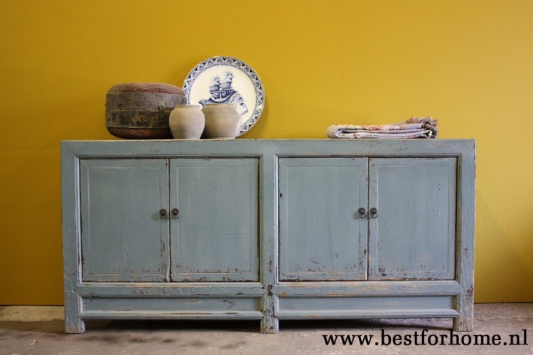 • Stoer uniek vintage landelijk lichtblauw gerecycled houten dressoir / wandmeubel NO.388...